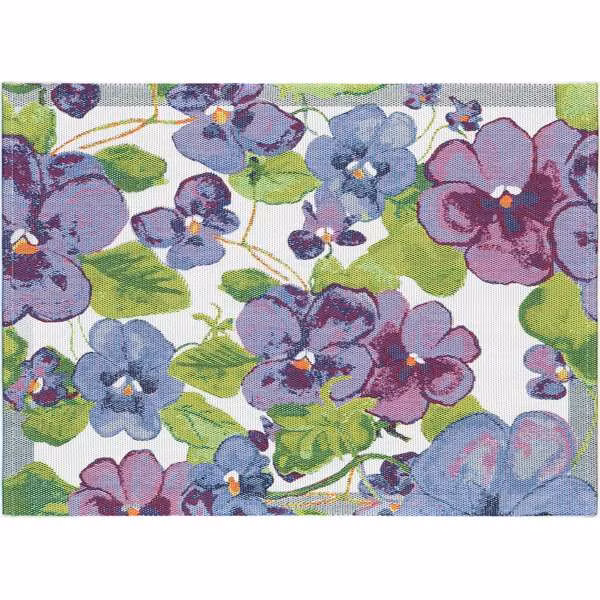Tablett/liten duk med motiv av härliga violer i vackra färger från Ekelunds Linneväveri.