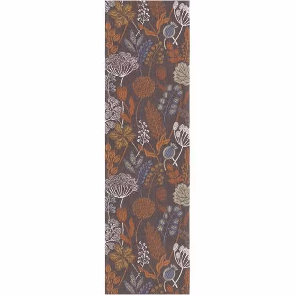 Bordslöpare från Ekelunds Linneväveri med kvistar och löv i höstiga toner på mörkblå botten.