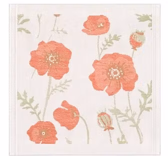 Liten duk/servett från Ekelunds Linneväveri med vallmoblommor i milda orange och ljusgröna nyanser mot en ljus bottenfärg.