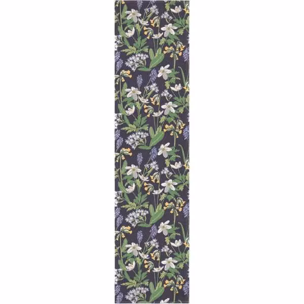 Vacker bordslöpare med naturtroget motiv av vårens blommor på blå botten från Ekelunds Linneväveri.