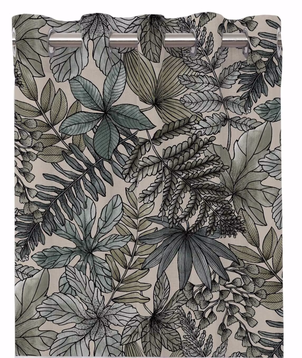 Öljettlängder med tryckt lövmönster i naturnära gröna toner på linnefärgad botten.