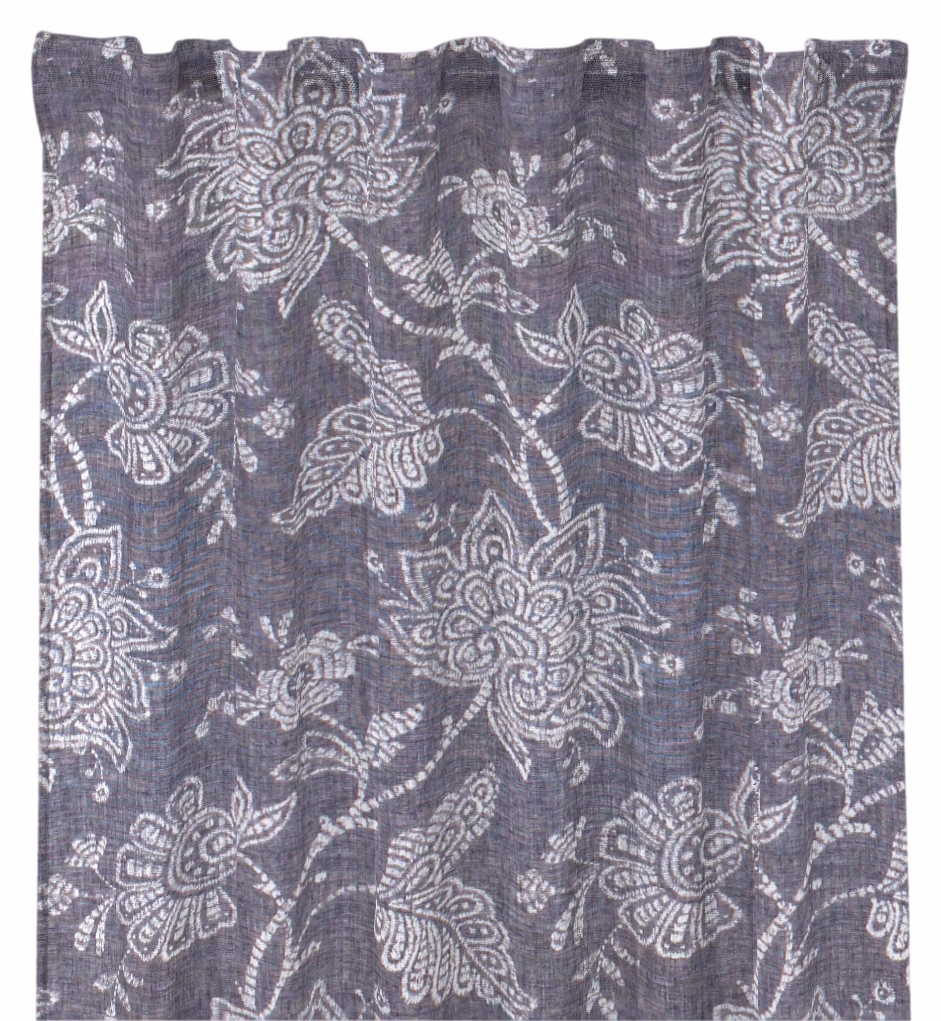 Skira gardinlängder med mönster av slingrande blommor på blå botten.Gardinen har multiband i ovankant, fållade långsidor och overlocksöm i nederkant. &nbs