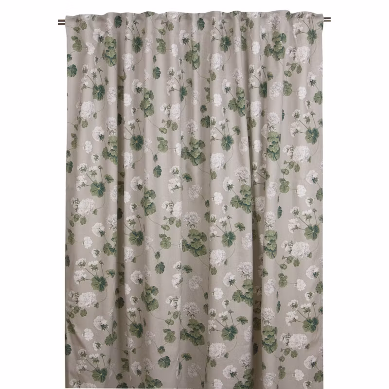 Gardiner med ljuvligt mönster av gråvita pelargoner och gröna blad på ljusgrå botten. Mönstret är tryckt på en slät bomullskvalitet.