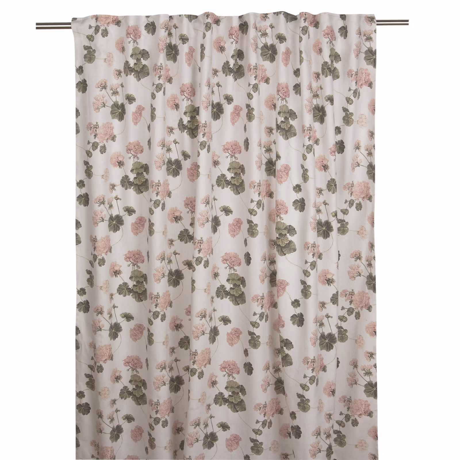 Gardiner med ljuvligt mönster av pelargoner i olika rosa toner och gröna blad på vit botten. Mönstret är tryckt på en slät bomullskvalitet.Gardinen har få