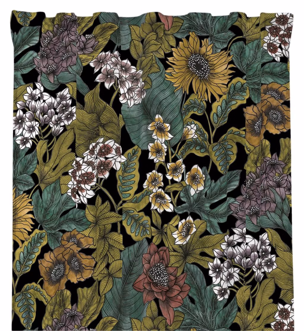Skira multibandslängder med mönster av blommor och blad i sensommarfärger av svensk designer.Gardinen har multiband i ovankant, fållade långsidor och over