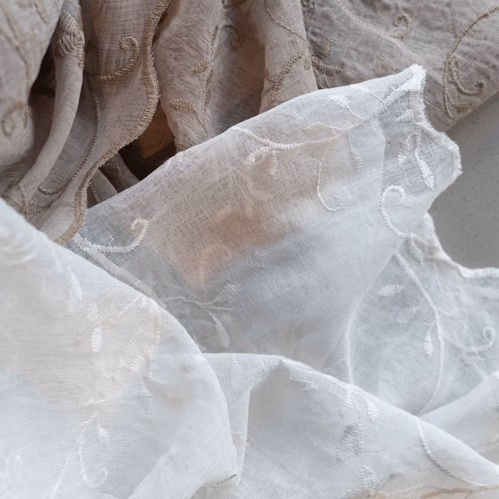 Bird en gräddvit, elegant broderad gardin med mönster av grenar, blad och fåglar. Tyget är skirt och silar ljuset samtidigt som en känsla av avskildhet ges.