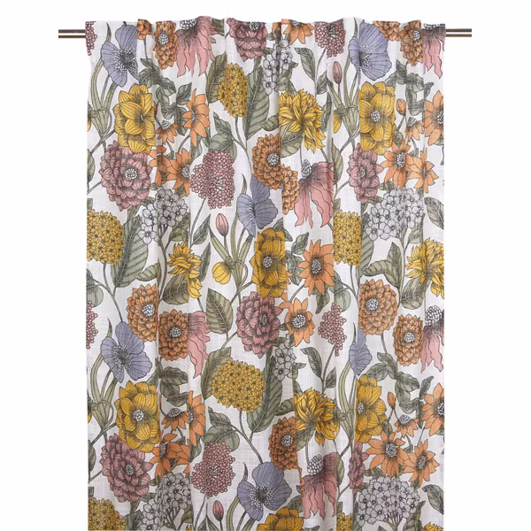 Gardinlängder med färgglada blommor på vit botten.Gardinen har fållade långsidor, multiband upptill och overlocksöm i nederkant.Multibandet ger flexibilit