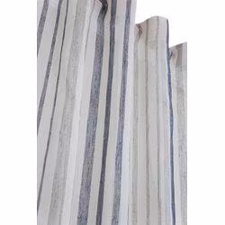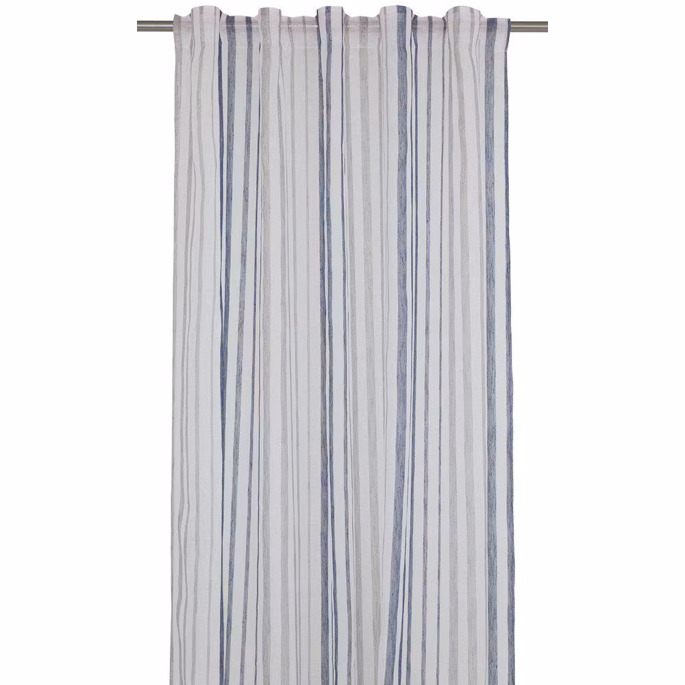 Fanni är en randig gardin i en skir kvalitet som silar ljuset. Ränderna, som är blå och grå-beige, är garnfärgade vilket gör att gardinen är lika fin på baksidan som på framsidan.