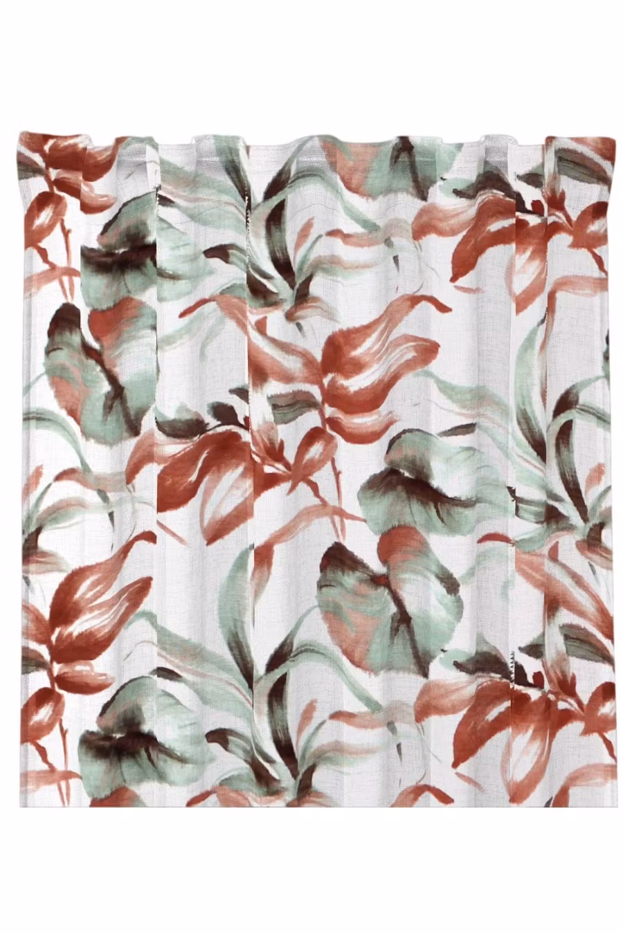 Jonna ett gardinset i sammet med blommor i rosa och vinrött och gröna blad på ljus botten. Gardinen har multiband upptill, fållade långsidor och over