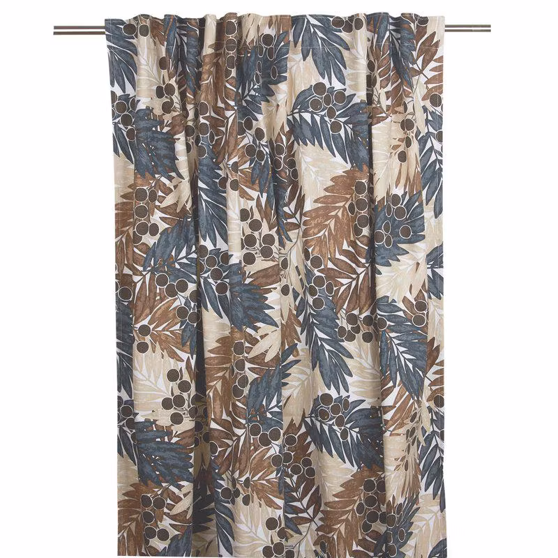 Gardiner mönstrade med blad i olika bruna och blåa toner på ljus botten. Mönstret är tryckt på en slät bomullskvalitet.Gardinen har fållade långsidor, mul