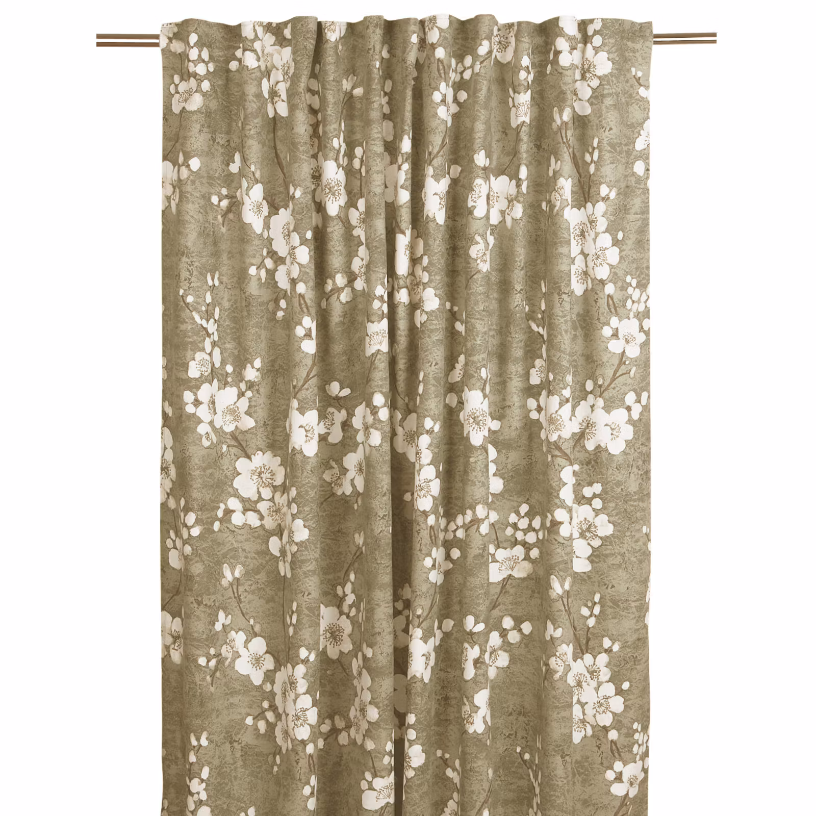 Gardiner med vackert blommönster på grön botten. Mönstret är tryckt på en slät bomullskvalitet.Gardinen har fållade långsidor, multiband upptill och overl