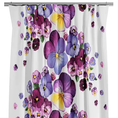 Gardin med med violer i olika lila toner och gröna blad på offwhite botten. Mönstret är tryckt på en fin bomullskvalitet.Design av MiaLotta Arvidsson-MarsGardin