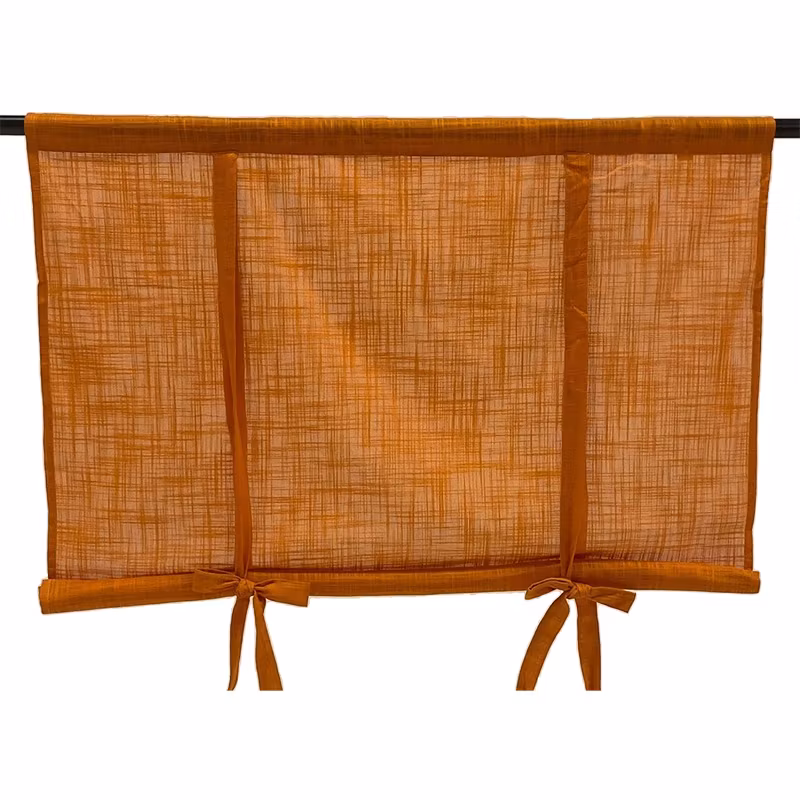 Enfärgad hissgardin i ett glesväv bomullstyg med olika tjocka trådar som skapar textur och släpper genom ljus.Upptill finns kanal. Hissgardinen rullas upp