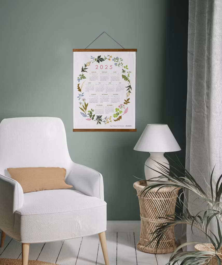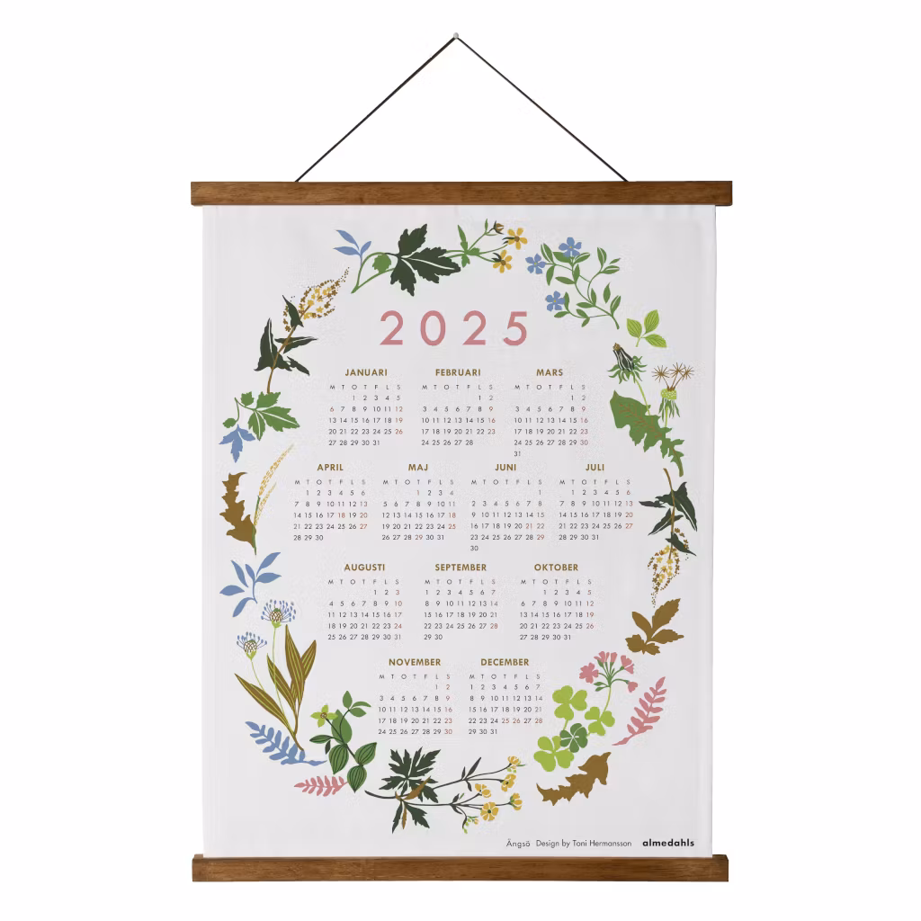 Almedahls tygkalender i ny storlek med magnetiska lister i trä är avsedd för väggupphängning.