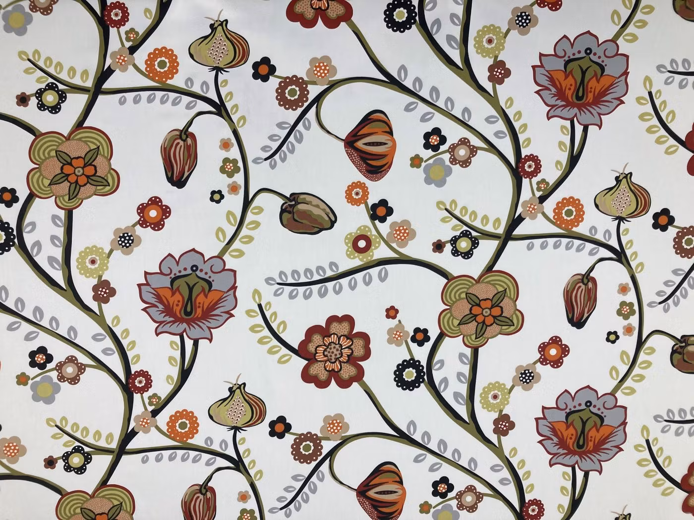 Satinmetervara med allmogeinspirerat mönster i färgerna rött, orange, grönt, svart och grått.Bredd 140 cmMönsterrapport 64 cmMaterial: 70% polyester, 30% bomull