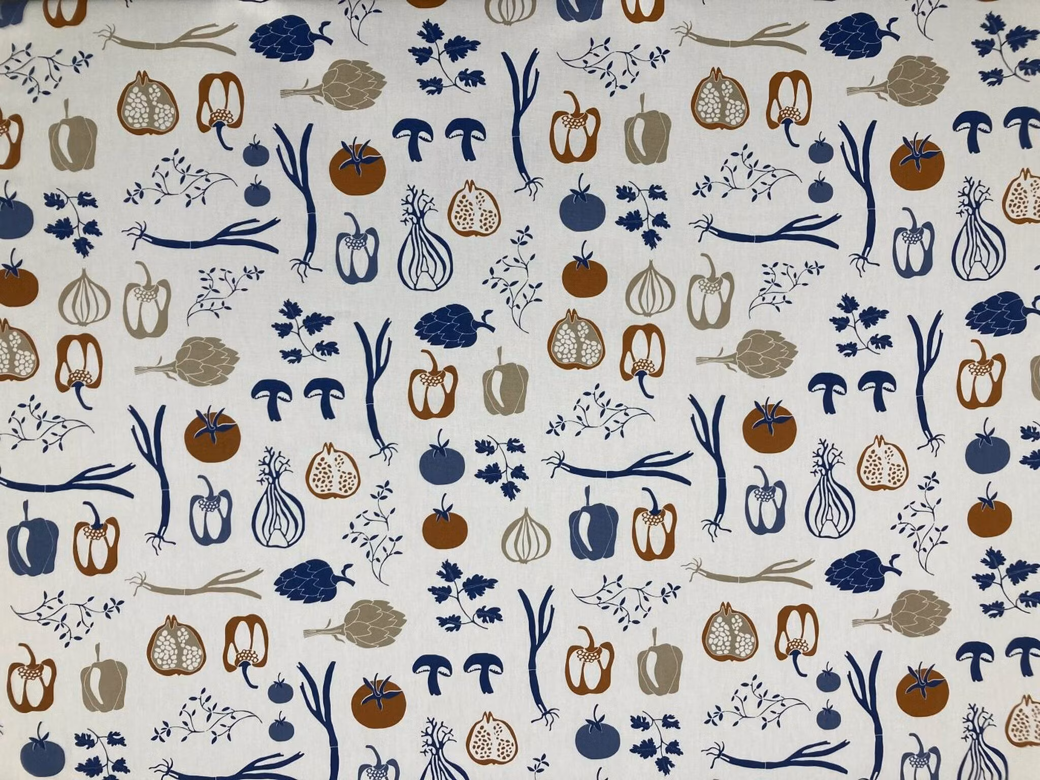 Härlig metervara till köket med mönster av grönsaker och örter i blå och bruna nyanser på ljus botten. Tyget passar fint till gardiner, förkläden, grytlappar etc.