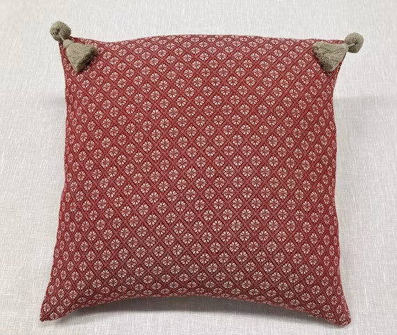Vackert rött kuddfodral med vitt mönster i jacquardvävd bomull.Fodralet har tofsar i de övre hörnen, är lika på båda sidor och har en dold dragkedja isydd nerti