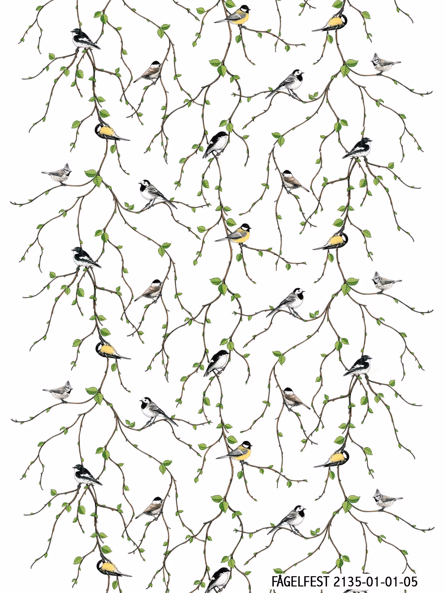Fågelfest, metervara prydd med fåglar av olika slag bland björkkvistar och vårgröna löv.Design av Mialotta Arvidsson Mars.Bredd 150 cmMönsterrapport 64 cmMateri