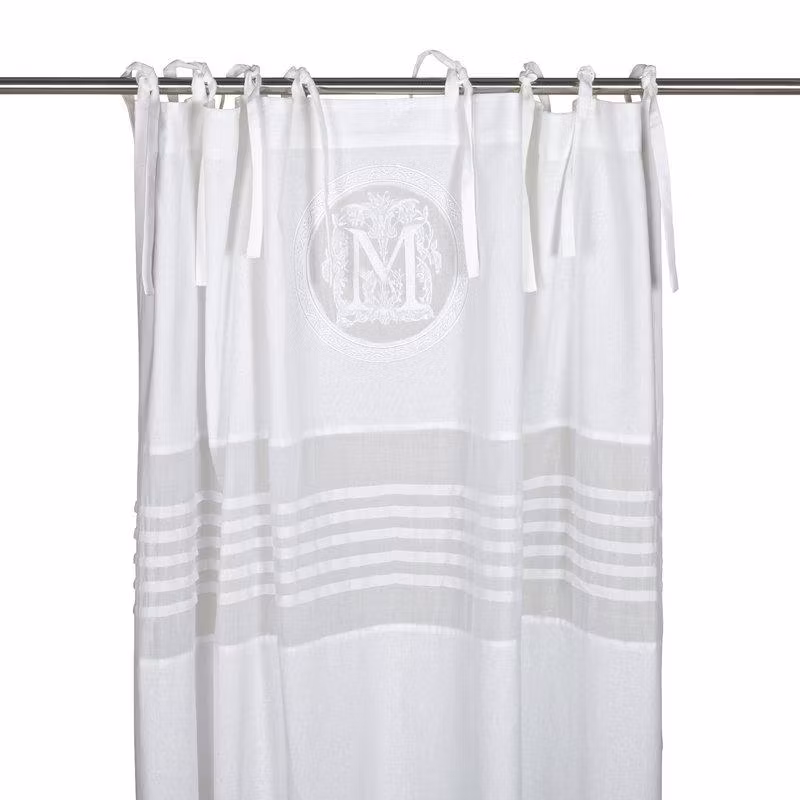Ljuvliga, vita gardinlängder i romantisk stil med broderat monogram. Gardinen har fållade långsidor, knytband upptill och overlocksöm i nederkant.Sy upp e