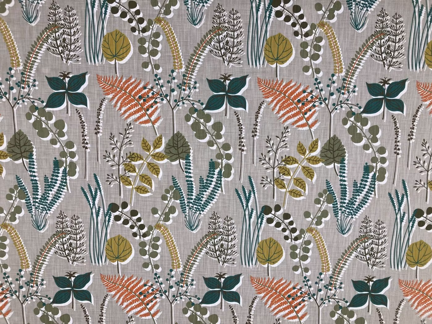 Botanik, metervara med mönster från växtriket i olika nyanser av grönt med inslag av orange. Bottenfärgen är gråbeige.Bredd 150 cmMönsterrapport 64 cmMaterial: