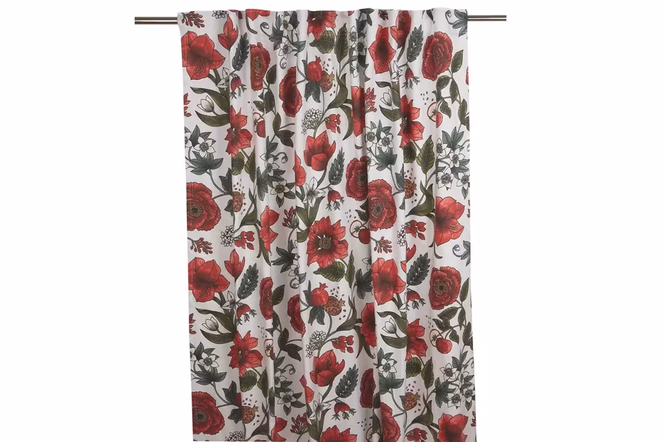 Multibandslängder med blommor och blad i rött och grönt på vit botten.Gardinen har fållade långsidor, multiband upptill och overlocksöm i nerderkant.Multibandet