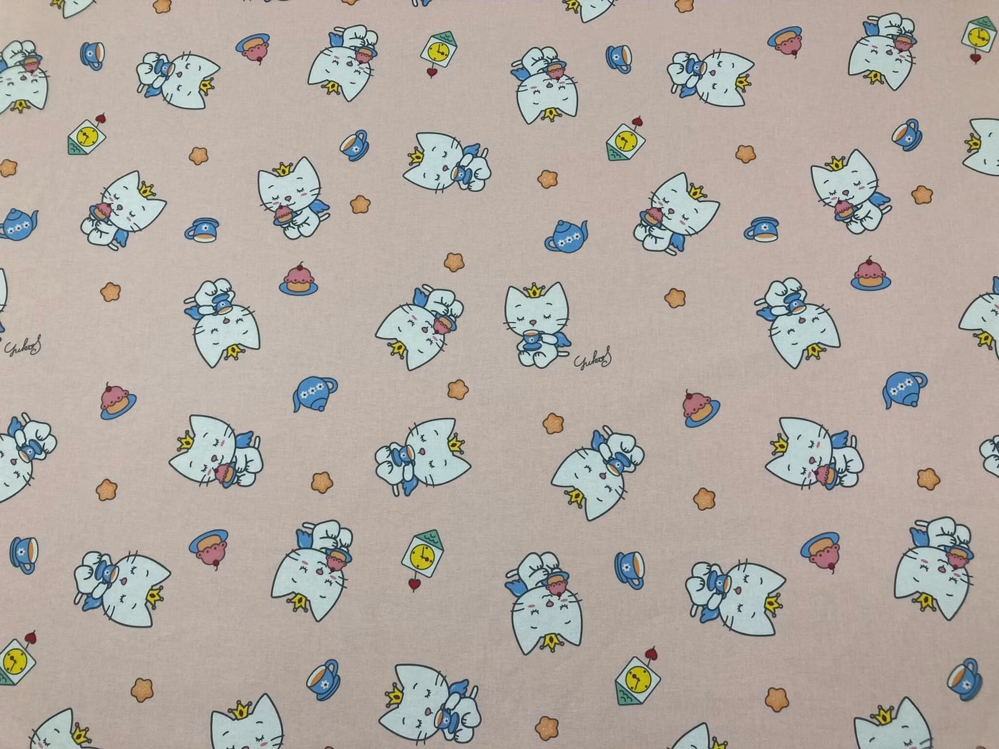 Fin metervara med söta prinsessor som fikar. Bottenfärgen är peachrosa. Stuvbit på 3 meter.Tyget passar perfekt till gardin, kuddfodral eller kanske en söt klän