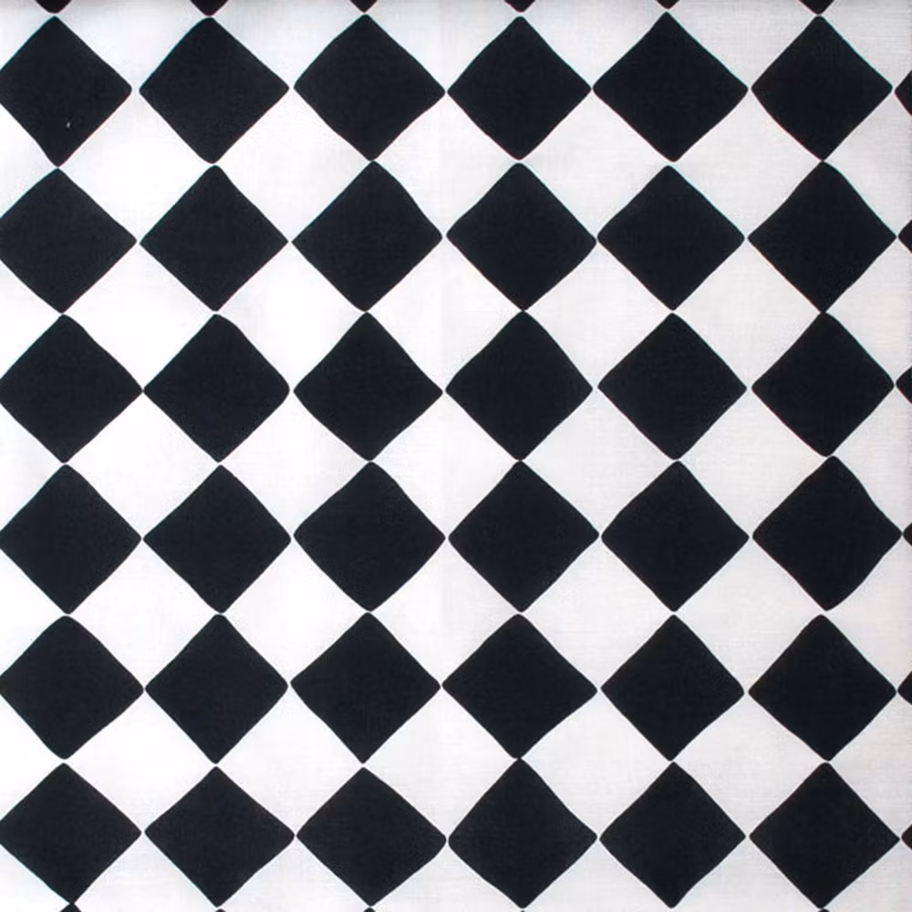 Harlequinrutor i vitt och svart.Design av Bitte StenströmBredd 150 cmRapport 6 cm100% bomullI lager: 9,3 meterOBS! Ingen returrätt på klippta metervaror - konta