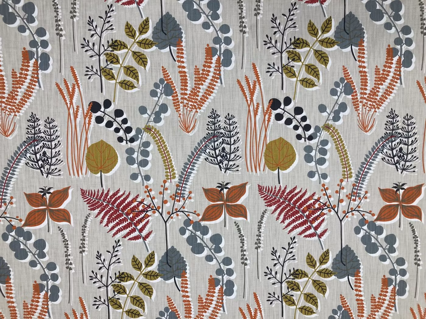 Botanik, metervara med mönster från växtriket i färger som orange och grönt. Bottenfärgen är gråbeige.