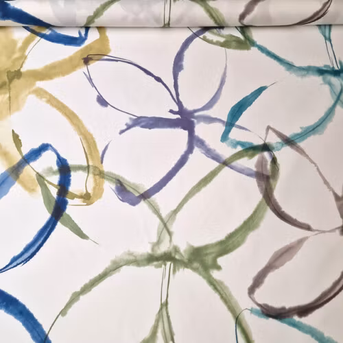 Metervaran Daily har ett digitaltryckt mönster i blå, gröna och gula toner på offwhite botten.