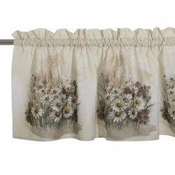 Gardinkappa på metervara med vackert blomstermotiv av prästkragar och klöver. Mönstret är handmålat av den norska konstnären Grethe Solemslökk.Upptill och nerti