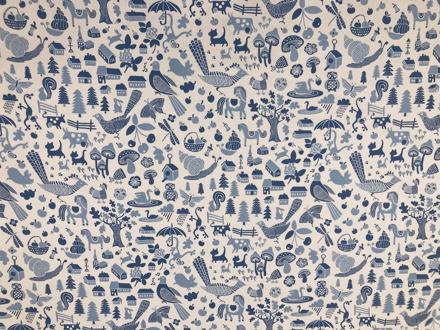 Offwhite metervara med mönster av olika byggnader, fåglar, djur och natur i blå toner. Tyget passar bra till gardiner, kuddfodral, draperier m.m.