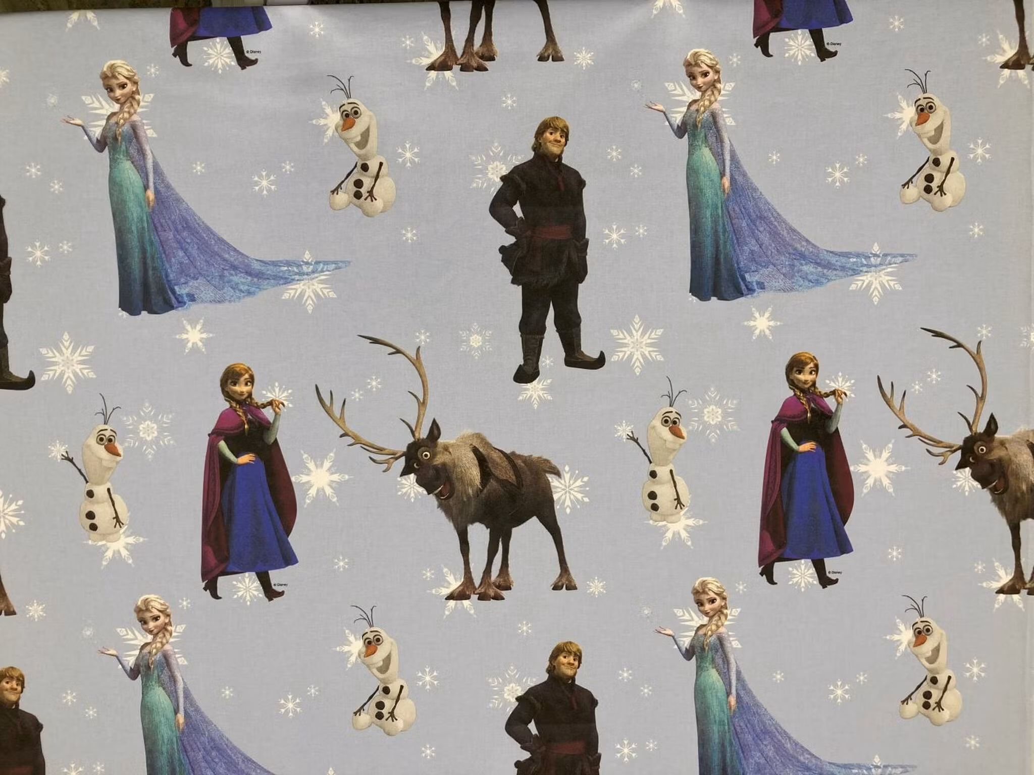 Motiv från Frozen tryckt på ljusblå botten. Tyget passar fint till gardiner, kuddar etc.