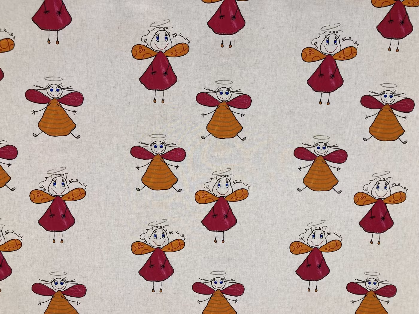 Söta änglar i cerise och orange på naturfärgad botten. Motivet är tryckt på ett mjukt och följsamt tyg som passar lika fint till hemtextil som till kläder.