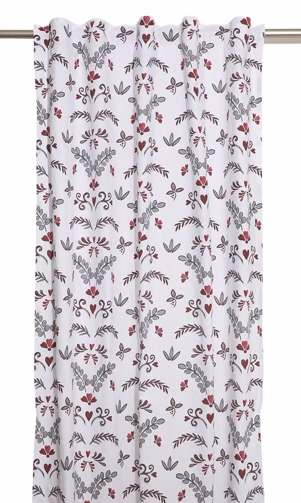 Gardinen har multiband i ovankant, fållade långsidor och overlocksöm i nerderkant.