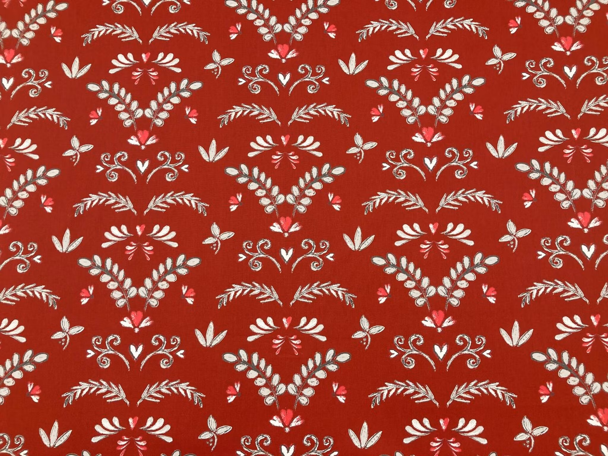 Metervara med mönster av olika kvistar i vitt och röda hjärtan på en mörkare röd botten.Bredd 120 cmMönsterrapport 32 cmMaterial: 100% bomullI lager: 16 meterOB