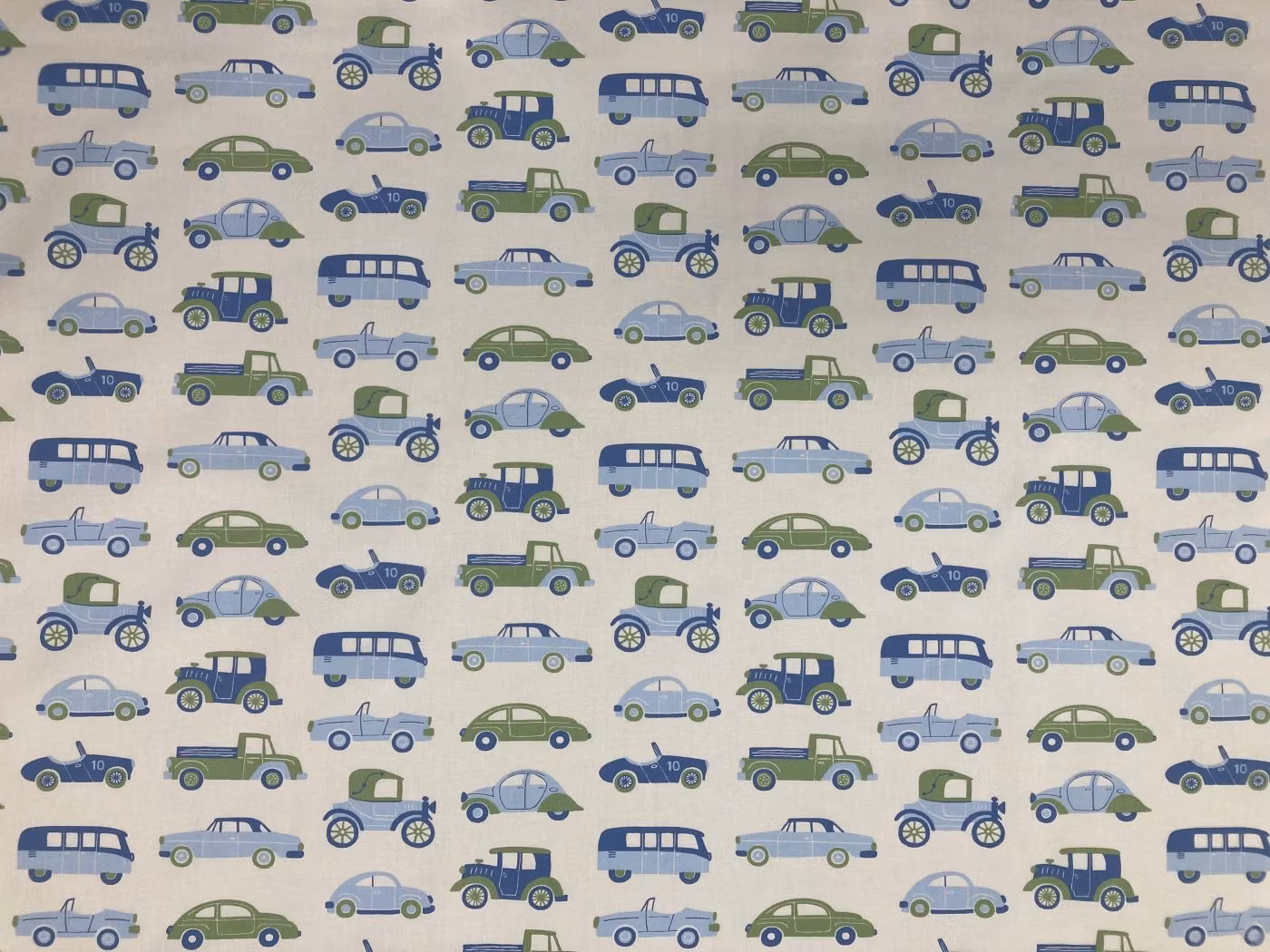 Fin metervara med bilar i blått och grönt på oblekt botten. Tyget passar perfekt till gardiner, kuddfodral, draperier m.m.