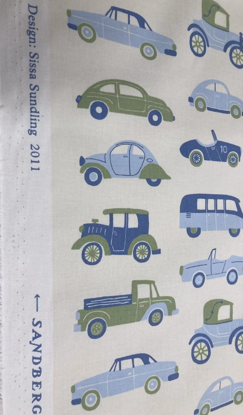 Fin metervara med bilar i blått och grönt på oblekt botten. Tyget passar perfekt till gardiner, kuddfodral, draperier m.m.Bredd 150 cmRapport 37 cmMaterial: 100