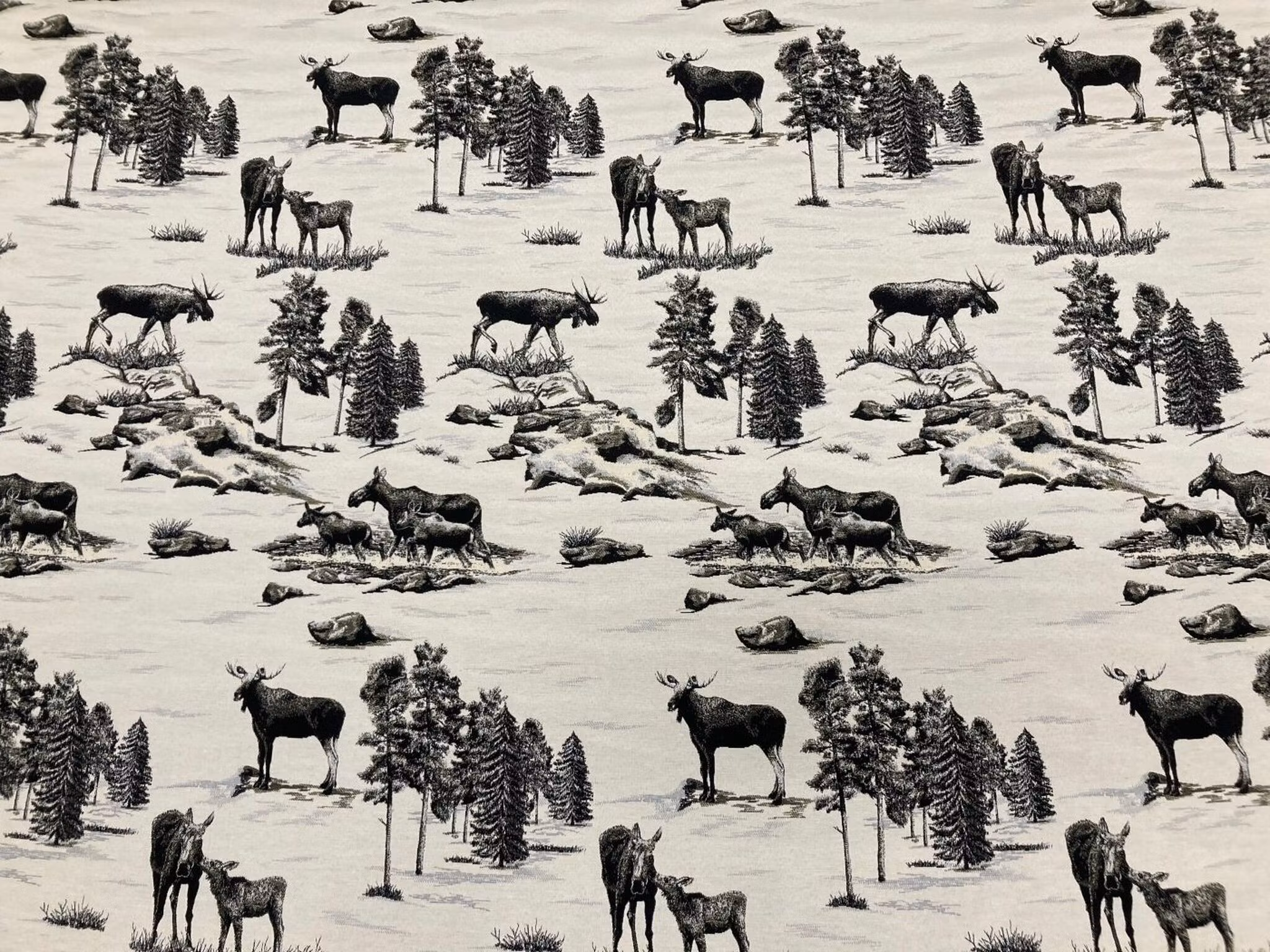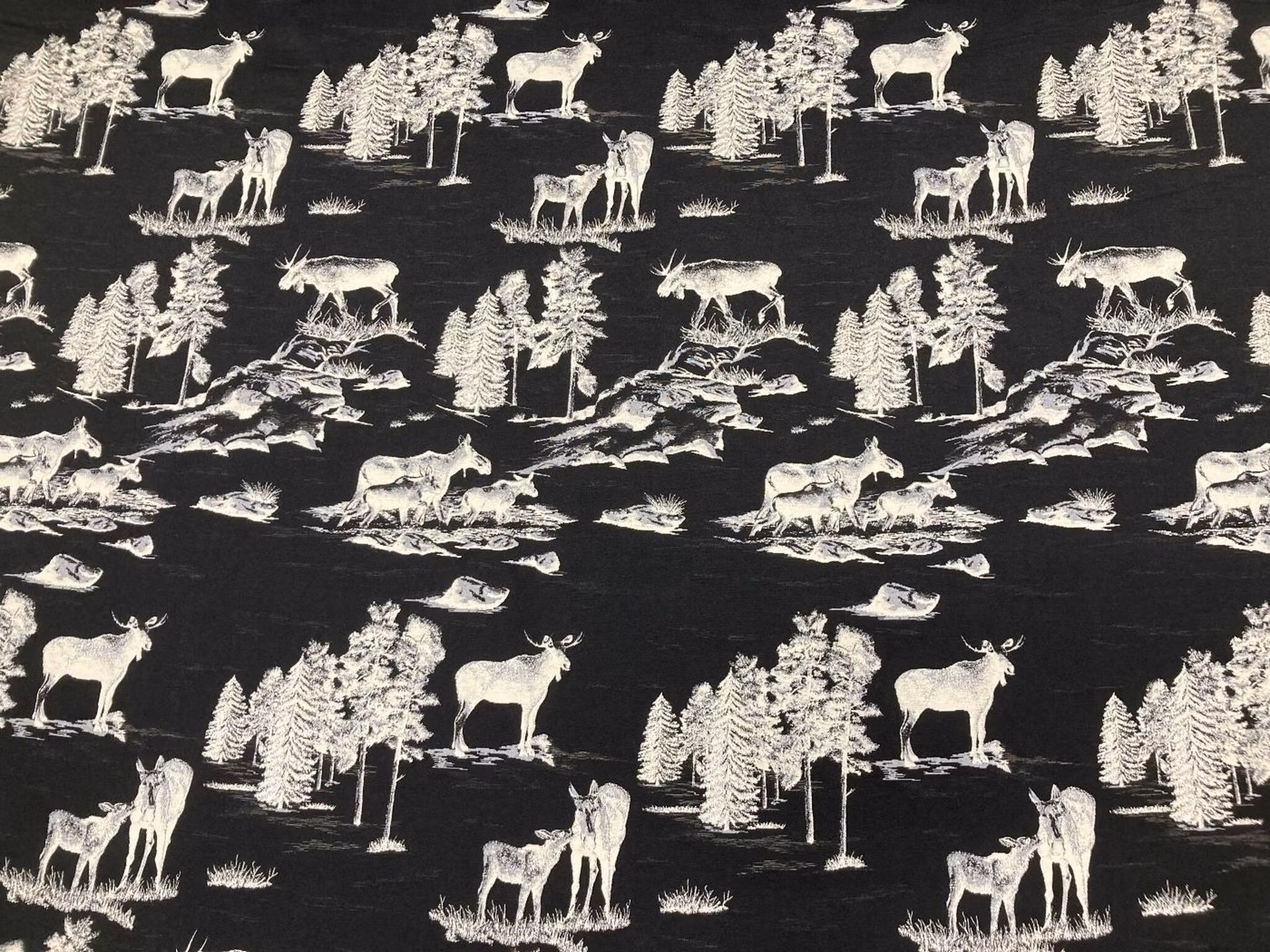 Jaquardvävd metervara med älgar och träd i färgerna natur och svart. Jaquard tillverkas med en speciell och avancerad vävteknik för att få fram vackra, ofta vän