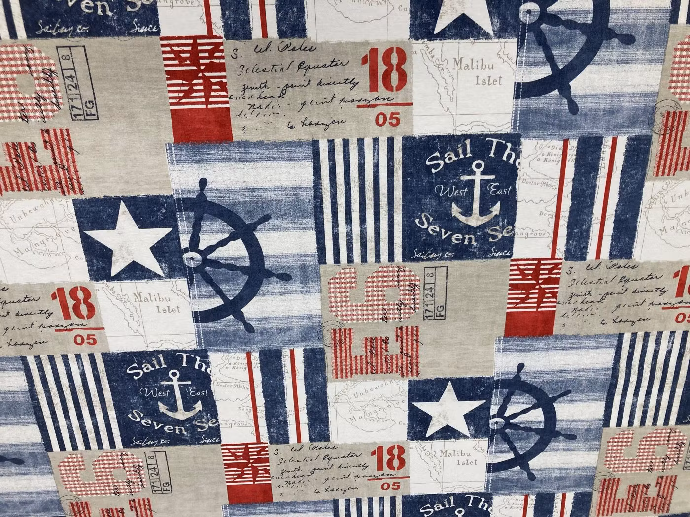 Marint mönster med ankare och skeppsrattar i färgerna rött, blått, sand och vitt.