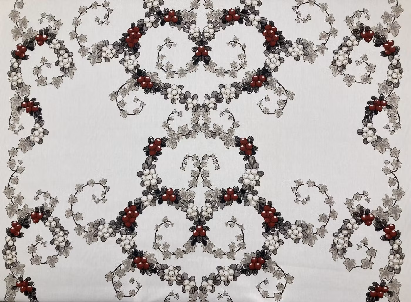 Metervara med motiv av slingrande murgröneblad i beige/guld och röda bär på en offwhite botten.