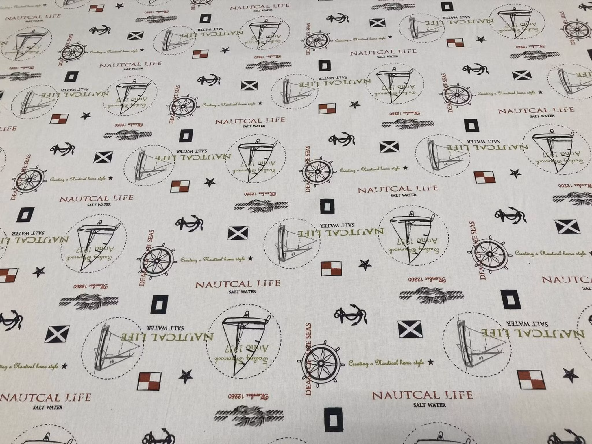 Mjukt och följsamt småmönstrat tyg med marint mönster i svart, rött, grönt och grått på offwhite botten.Bredd 145 cmMönsterrapport 32 cmMaterial: 100% bomullOBS