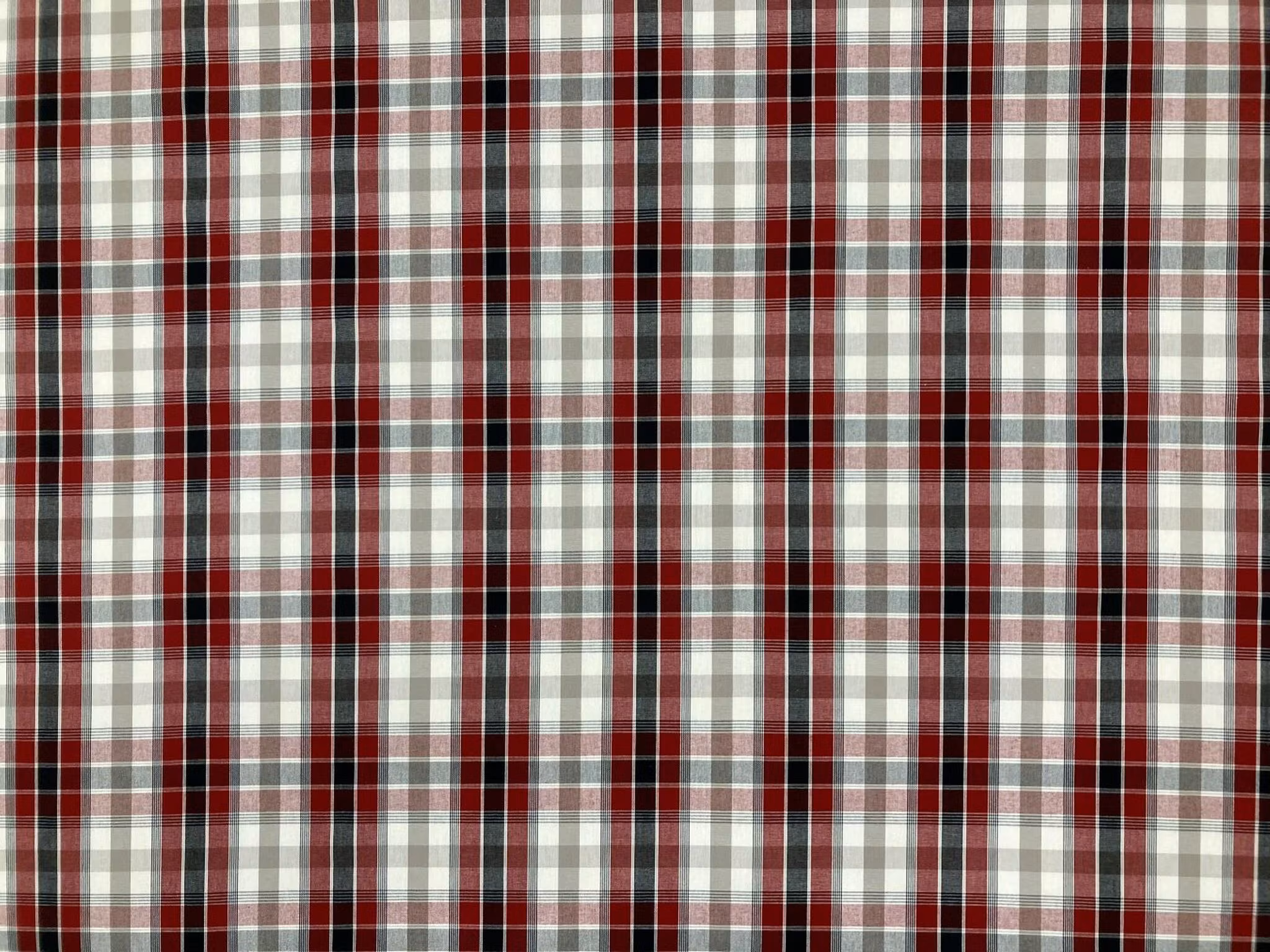 Vävd, rutig metervara i färgerna rött, svart, vitt och beige.