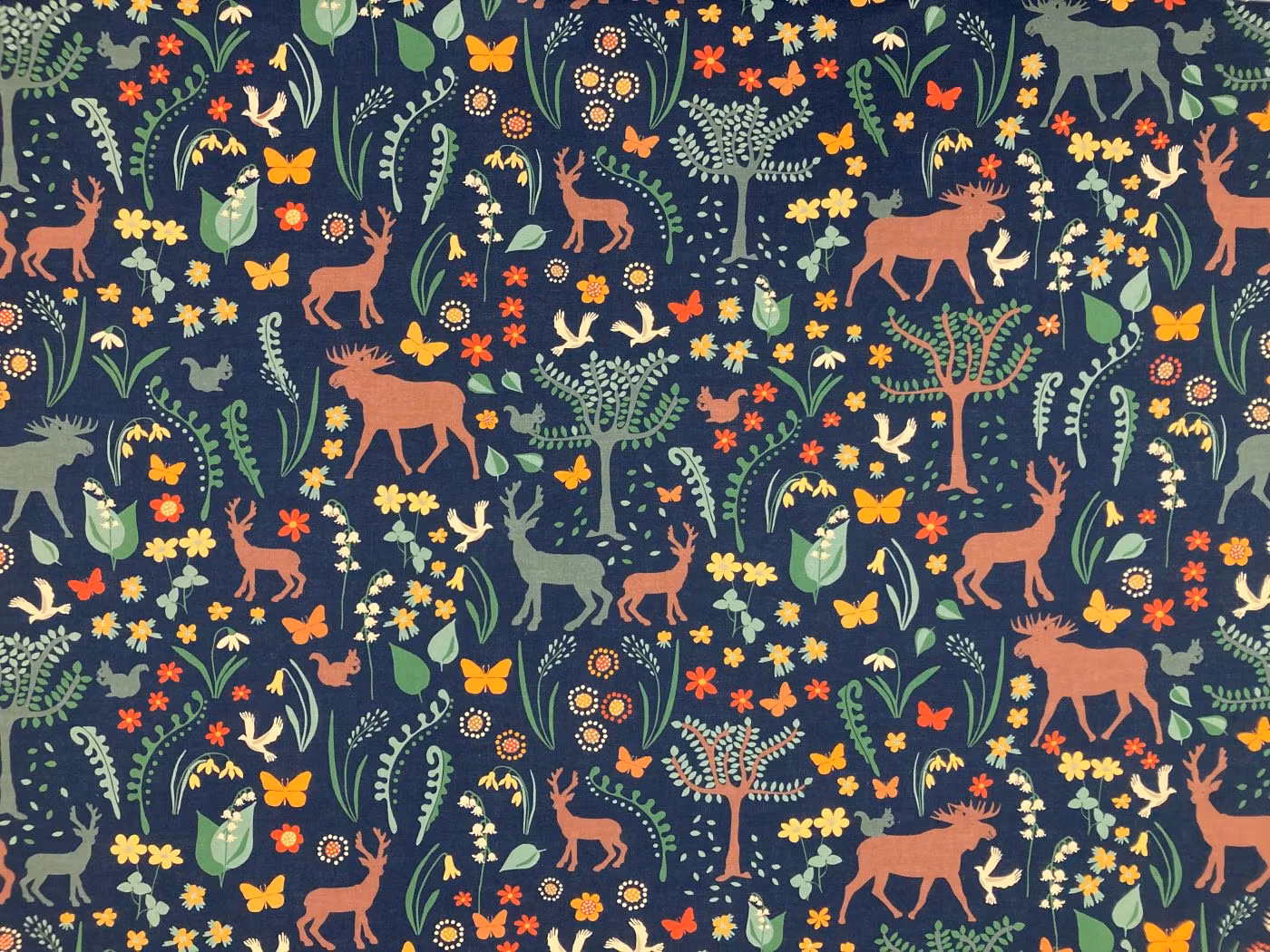 Mönster med inpiration från skogens växter och djurDesign av Björk-Forth.Bredd 150 cmMönsterrapport 64 cmMaterial: 100% bomullOBS! Ingen returrätt på klippta me