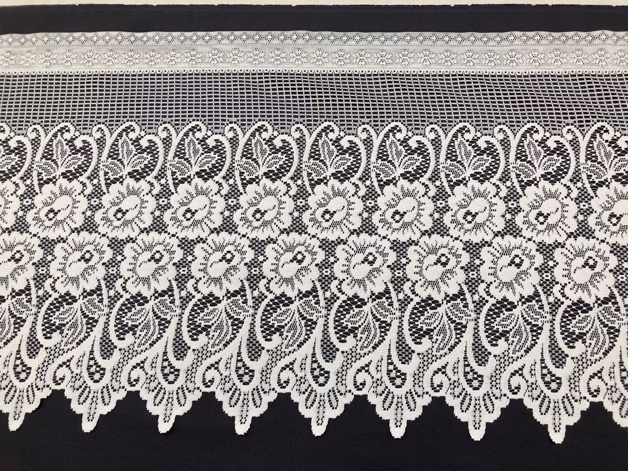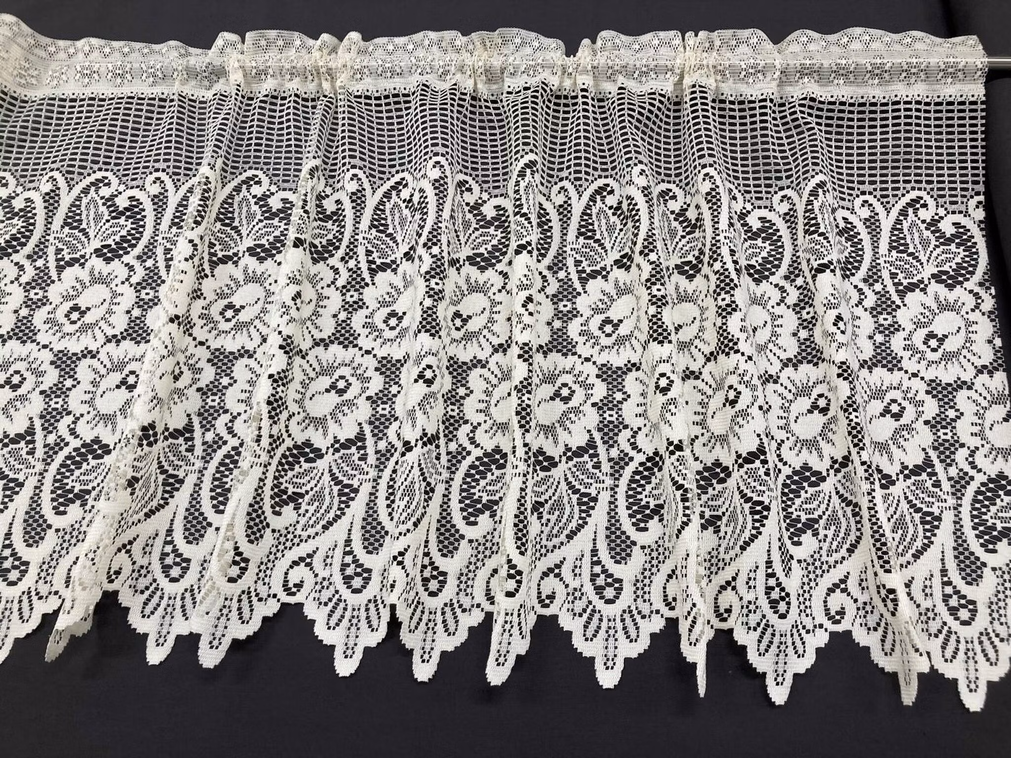 Skir kappmetervara i oblekt, aningen aprikos, spets. Upptill finns kanal för tunn stång och ett litet rynkhuvud, kortsidorna är ofållade.Höjd 57 cm inklusive ry