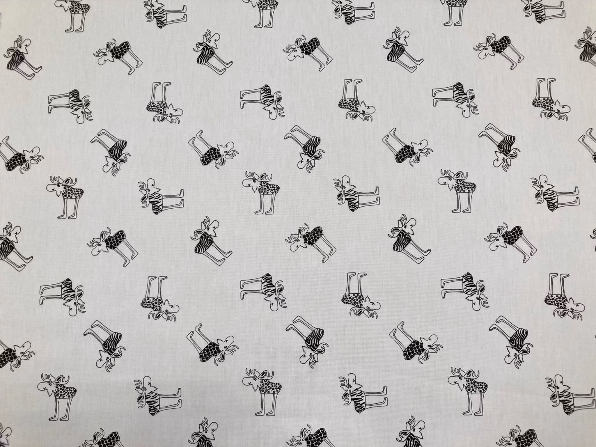 Metervara med skojigt mönstrade älgar i svart på vit botten.