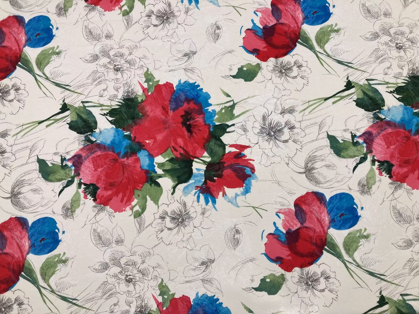 Blomma, metervara med färgglatt mönster i cerise och turkos.