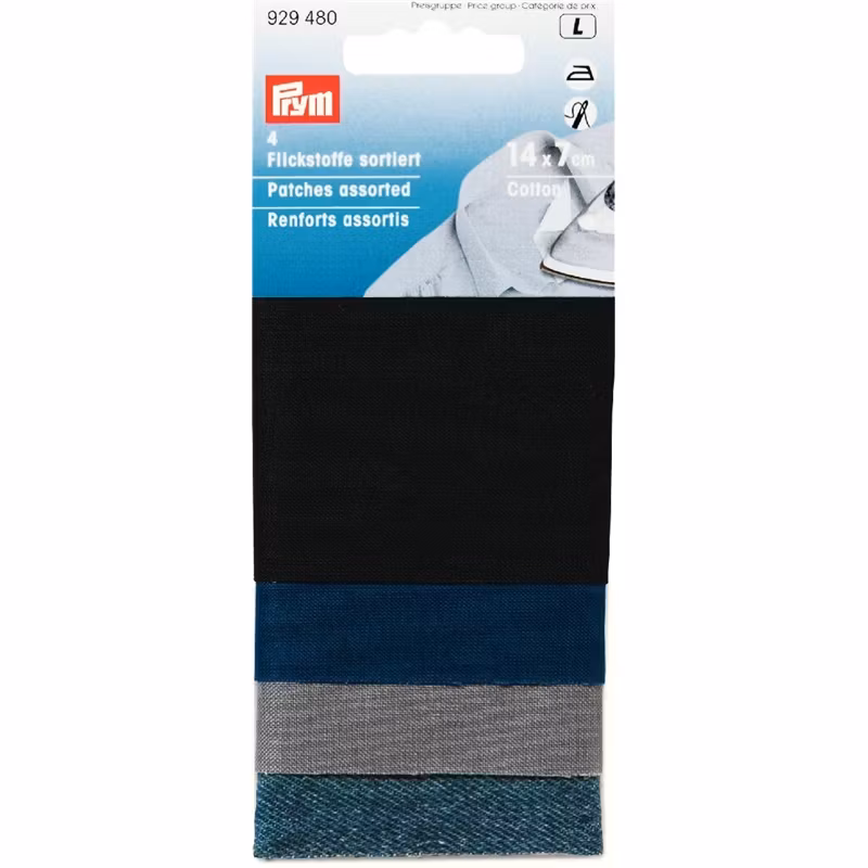 Jeanslaglappar i 4 olika färger som lätt kan strykas eller sys på bomullstyger för reparation av slitna fläckar eller hål.Kommer i ark på 14 x 7 cm, kan klippas